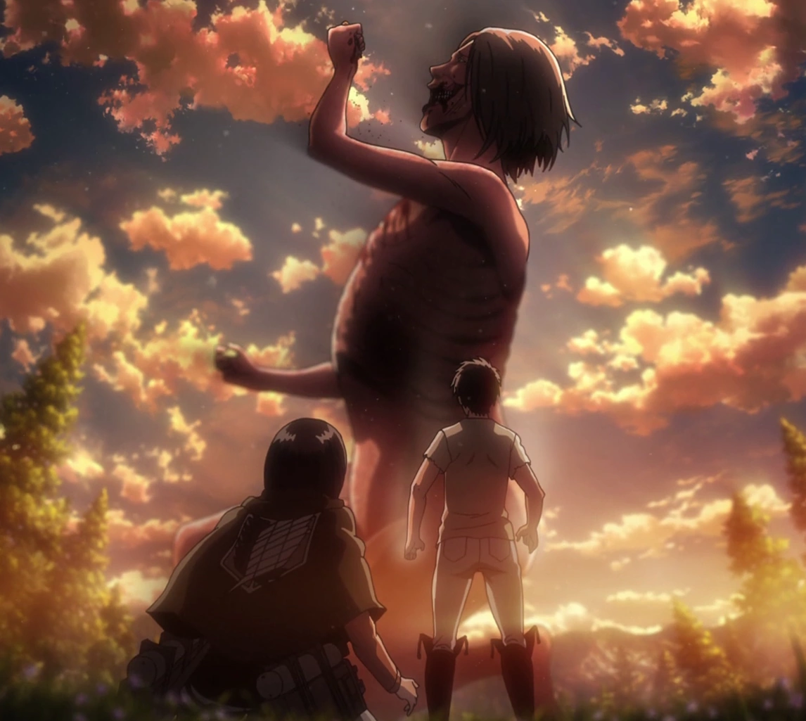 Eren Jeager , Mikasa Ackerman y Armin Arlert , vivían en una ciudad protegida por unos grandes muros de los titanes, unas bestias de grandes dimensiones de entre 3 y 15 metros de alto que se alimentan únicamente de humanos .Las murallas median 50 metros asi que no tenian que preocuparse por los titanes pero no se esperaban el ataque de un titan mayor que estas .